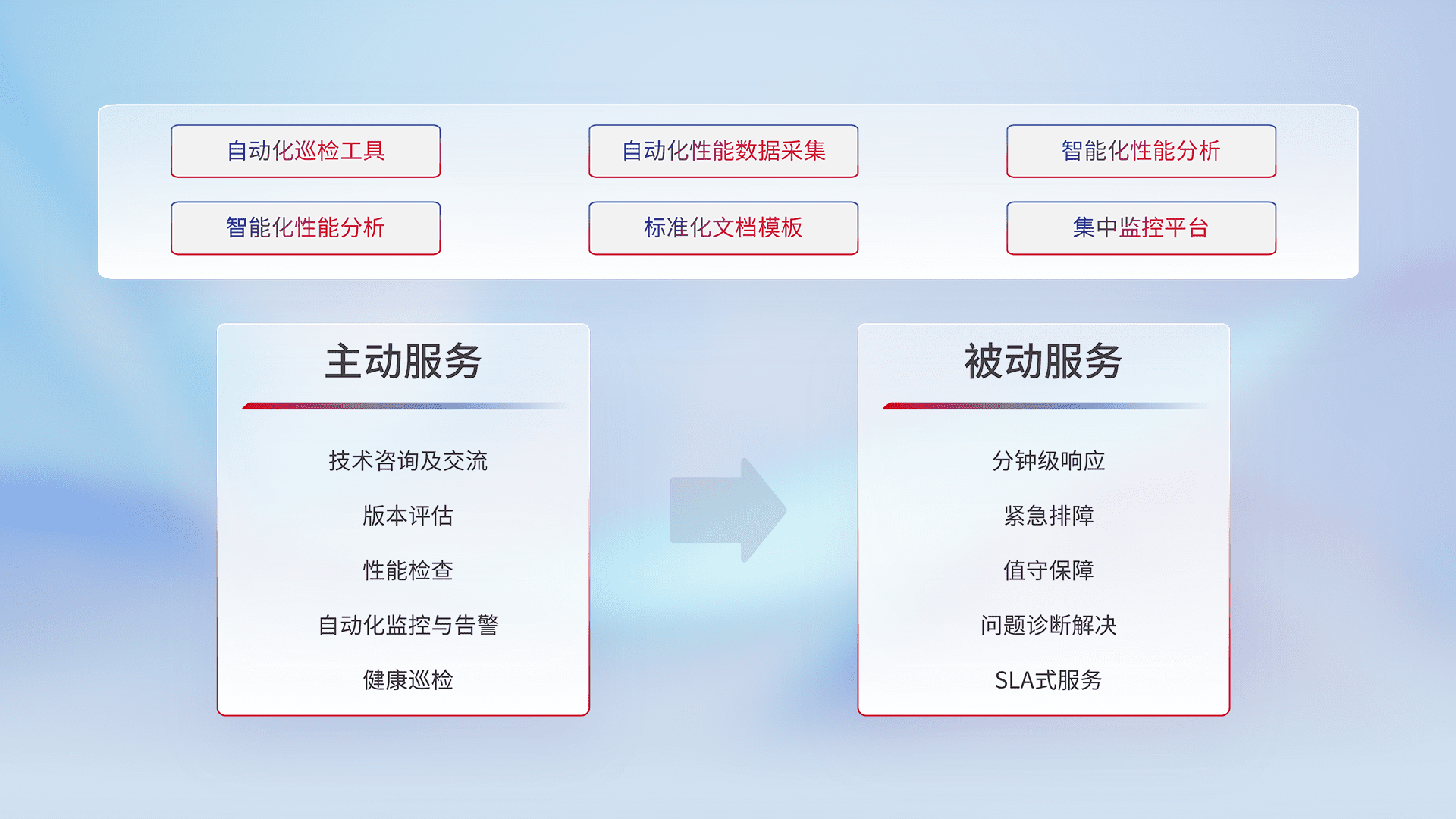 智能化工具和标准化文档,,保障服务质量,,提供主动服务(包含技术咨询、、、、版本评估、、、、性能检查、、自动化监控与告警、、、健康巡检)和被动服务包含(分钟级响应、、、、紧急排障、、值守保障、、、、问题诊断解决、、、、SLA服务)。。。。